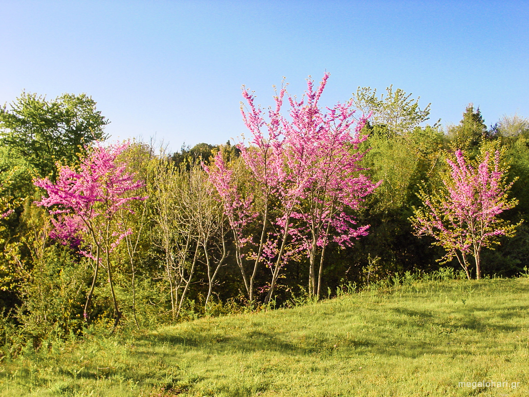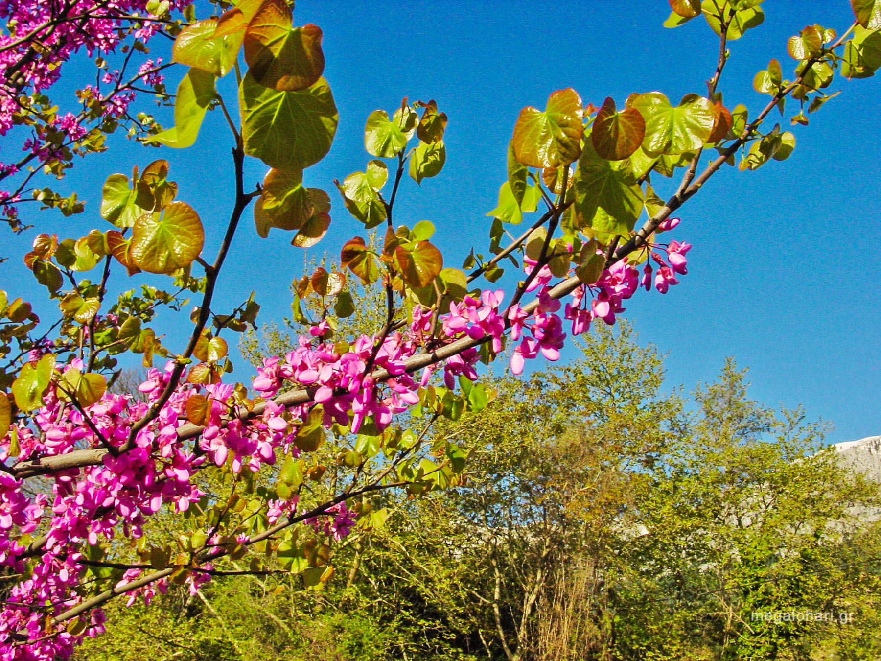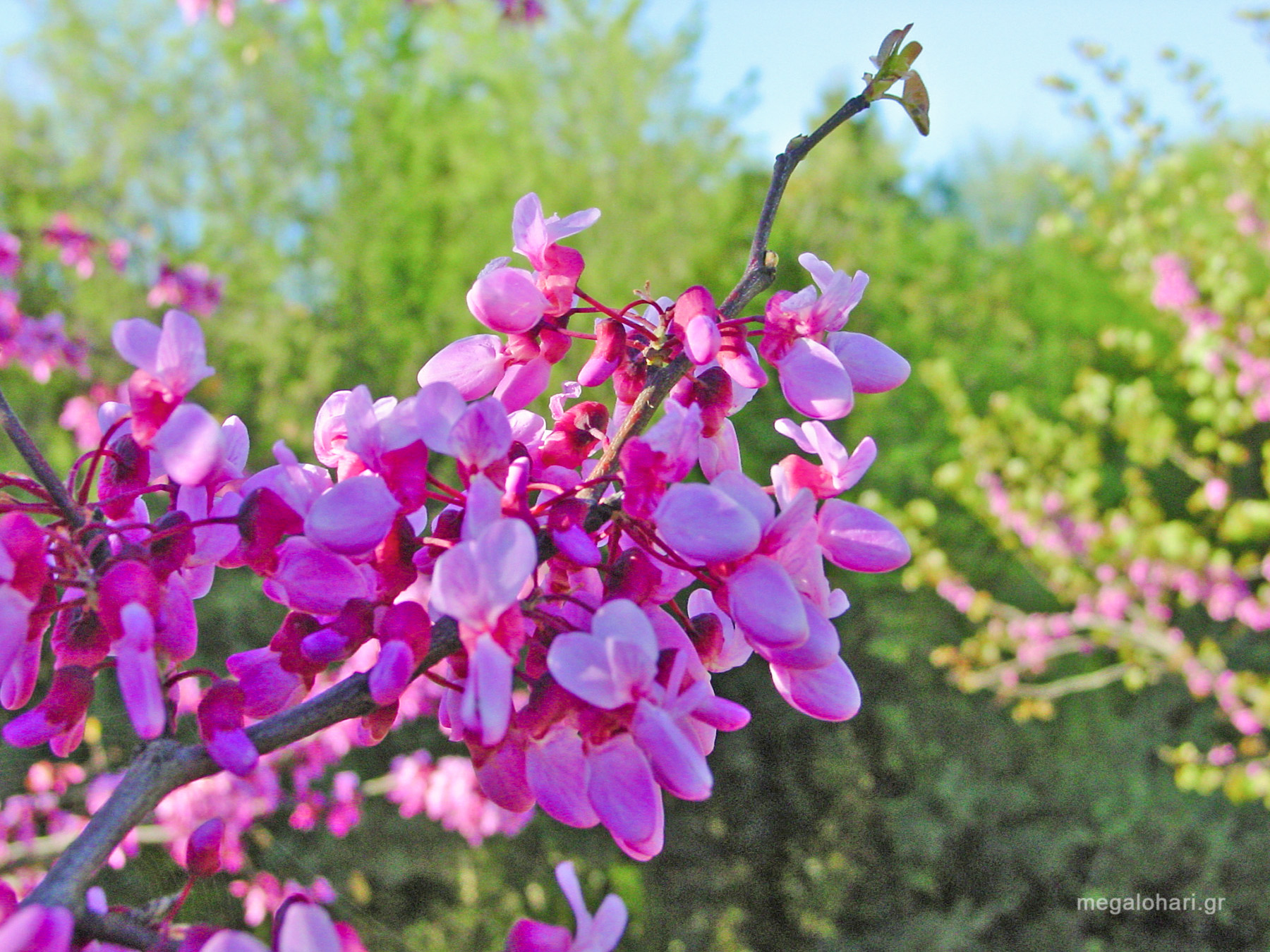 Πριν ακόμη βγάλει φύλλα, γεμίζει τα κλαδιά της με έντονα ροζ λουλούδια, που ξεχωρίζουν από μακριά μέσα στο πράσινο.