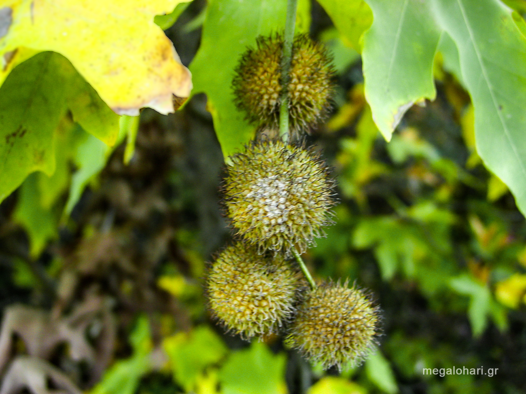 Οι σφαιρικοί, αγκαθωτοί καρποί του κρέμονται από τα κλαδιά και παραμένουν στο δέντρο για μεγάλο διάστημα, αποτελώντας γνώριμη εικόνα ακόμη και τον χειμώνα.