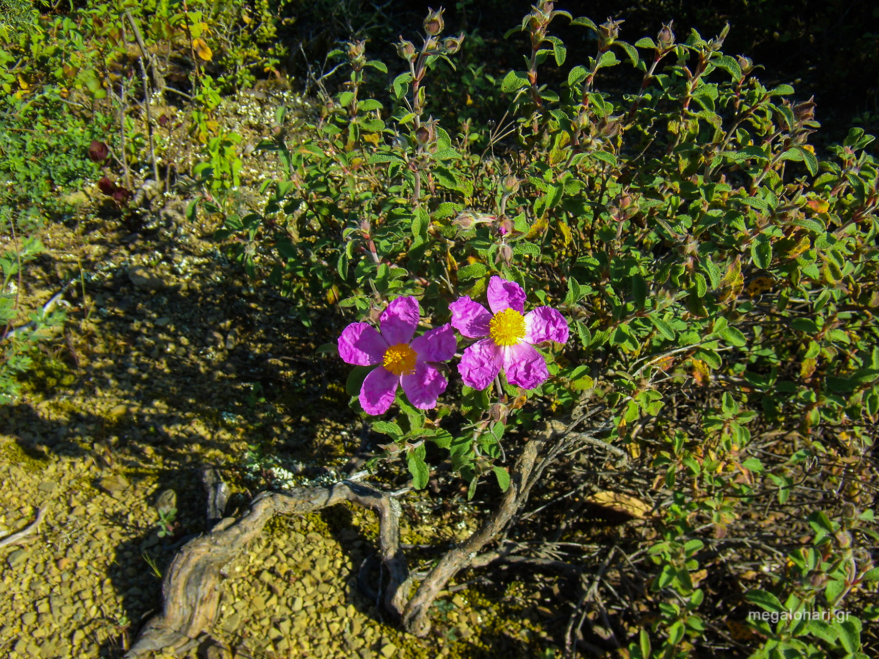 Στην περιοχή μας τη συναντάμε με λευκά ή ροζ άνθη, με τα χαρακτηριστικά «τσαλακωμένα» πέταλα και το έντονο κίτρινο κέντρο.